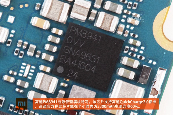图为高通PM8941电源管理模块特写,该芯片支持高通QuickCharge 2.0标准,高通官方称此芯片能在半小时内为3300mAh电池充电60%。