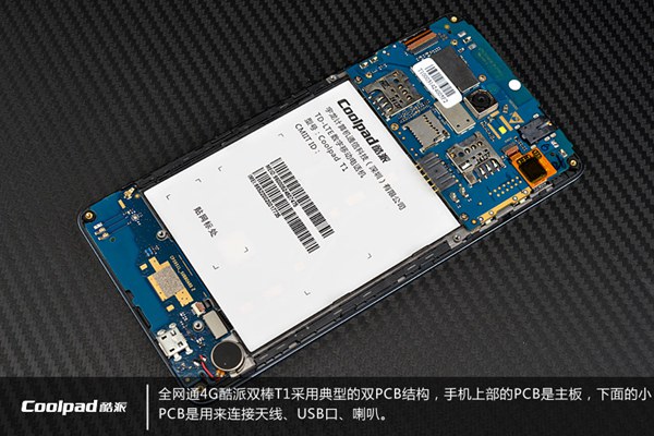 酷派双棒T1内部采用了典型的双PCB结构,手机上部的PCB是主板,下面的小PCB是用来连接天线、USB口以及喇叭等,如下图所示。