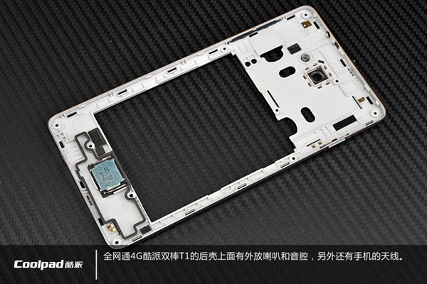 从拆卸下来的酷派双棒T1后壳上,我们可以看到有外放喇叭和音腔,另外还有手机的天线。
