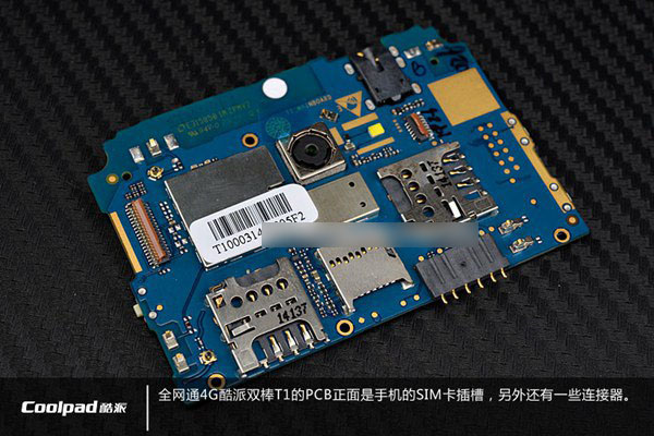 酷派双棒T1的PCB主板生面是手机的SIM卡槽,另外还有一些连接器,如下图所示。