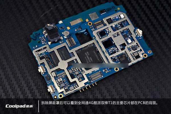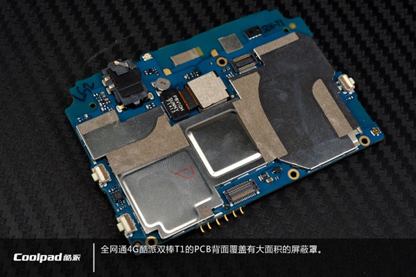 酷派双棒T1的PCB主板背面覆盖有大面积的屏蔽罩,毫无疑问,屏蔽罩下面就是手机芯片,如下图所示。