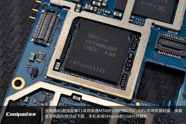 酷派双棒T1采用高通MSM8926四核CPU,CPU采用双层封装,换装在手机的存芯片下面,手机采用SKhynix的1GB内存颗粒。