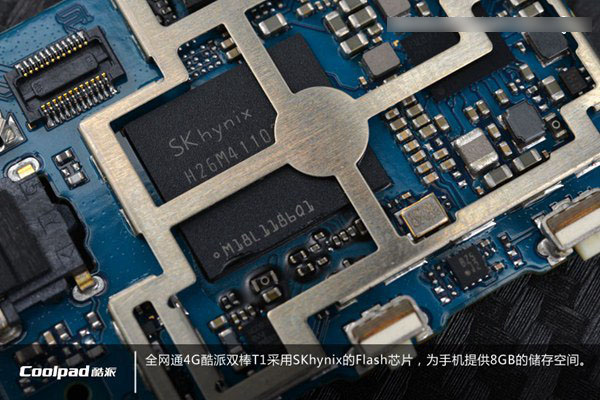 全网4G酷派双棒T1采用SKhynix的Flash芯片,为手机提供8GB的存储空间。