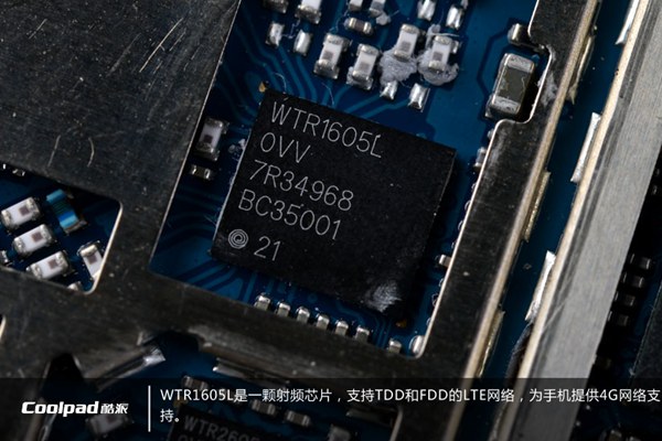图为酷派双棒T1内置的WTR1605L是一颗射频芯片,支持TDD和FDD的LTE网络,为手机提供4G网络支持。