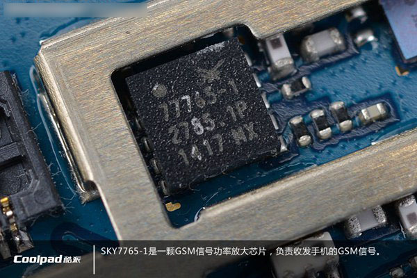 图为酷派双棒T1内置的SKY7765 GSM信号攻略放大芯片,负责收发手机的GSM信号。