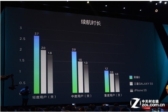 在发布会上,华为方面也是表示荣耀6轻度使用可达到2.7天左右,重度使用可维持1.2天左右。其理论待机时间为463小时(3G),414小时(4G)。