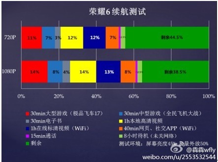 采用ROG技术调整分辨率为720P后,确实一定程度上减少了电量的消耗,同样的测试发现720P比1080P多剩余9%的电量,荣耀6采用5英寸的incell屏,720P和1080P在正常视距下