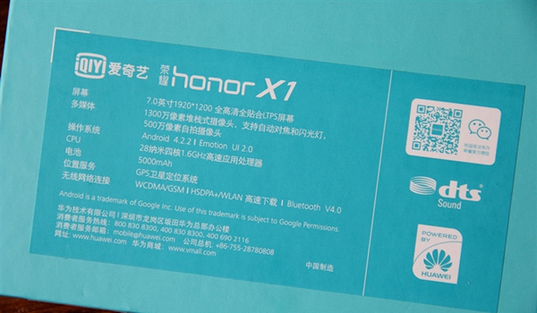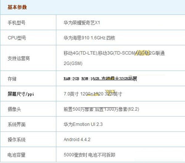从上面得知,荣耀X1爱奇艺版搭载了主频1.6GHz的华为海思Kirin 910四核处理器,内置2GB内存+16GB机身存储(最大支持32GB扩展,并支持OTG连接U盘),配备一块7寸全高清屏幕,分辨率为1920X1200,配备前置500万+后置1300万像素摄像头,内置5000mAh电池,系统运行基于安卓Android 4.4.2的Emotion UI 2.3系统,可以使用中国移动4G网络(TD-LTE)、移动3G网络(TD-SCDMA)以及移动/联通2G网络(GSM),三围为183.5X103.9X7.18mm,重239g.