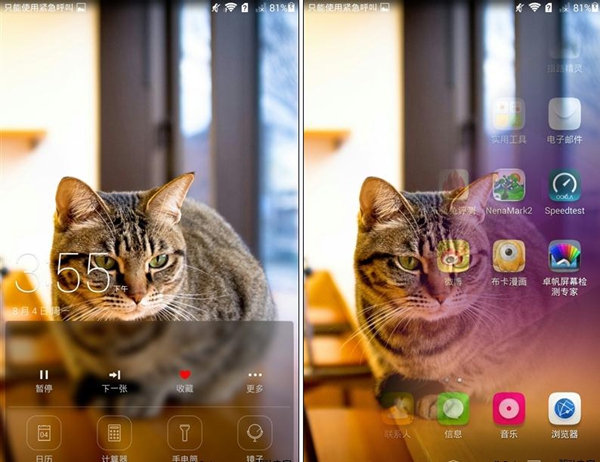 锁屏界面方面,该系统界面是最大的改变,系统壁纸来自网络,可以自动更新,只要屏幕一启动就可以切换不同的壁纸。另外,界面多出了手电筒以及镜子等快捷开关,操作方便快捷。