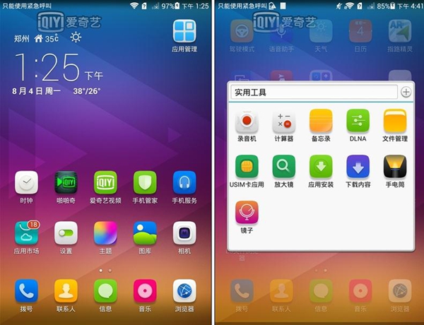 荣耀X1爱奇艺版与荣耀X1一个大的改变就是系统进行了升级,荣耀X1的系统是基于安卓4.2.2开发的Emotion 2.0,而荣耀X1爱奇艺版采用的是基于安卓4.4.2开发的Emotion 2.3,很多界面进行了优化和升级,其壁纸也加入了爱奇艺元素。