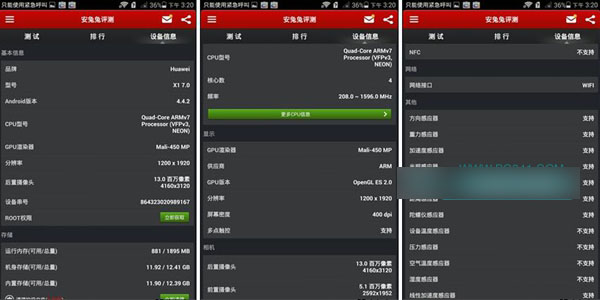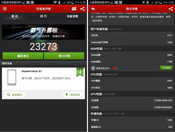荣耀X1爱奇艺版毕竟是以荣耀X1为原型,所以硬件方面没有太大的改变,依然采用华为海思Kirin 910四核处理器,主频1.6GHz,运行2G和16G内存组合,下面一起来看看荣耀X1爱奇艺版安兔兔测试详情。