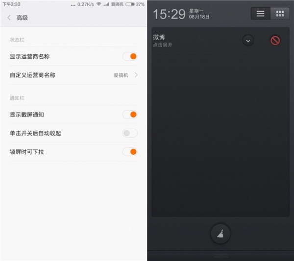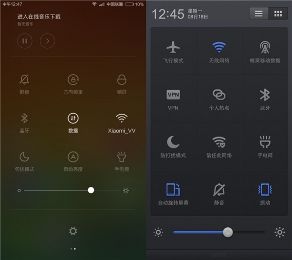 MIUI 6与Smartisan OS在下拉栏是整个系统中最为接近的部分了,两者同样有通知与快捷快关两个分页。但两者目前同样不支持快捷开关的选择与顺序调整,在个性化上稍显一般。