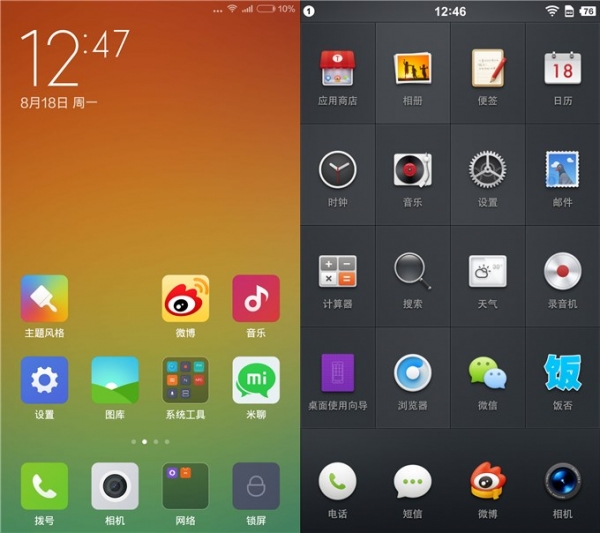 MIUI 6使用了更为彻底的沉浸式设计,并且背面的毛玻璃效果还会根据实际画面进行渲染出独立的背景纹路,整体更为时尚简洁,整体视觉效果会显得屏幕使用率更高。而Smartisan OS则很有旧版本iOS的味道,较为立体的图标设计以及区域间隔,也让人觉得熟悉而习惯。