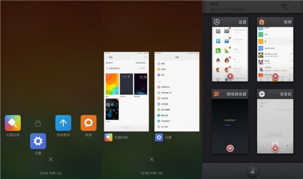 MIUI 6任务管理器还提供图标与缩略图两种显示模式,并且可方便的通过手势滑动进行单个任务的关闭与锁定。而Smartisan OS仅提供缩略图查看,并且还需要按击相应的关闭按钮,这样的设计使得在单手操作时就较为别扭了。