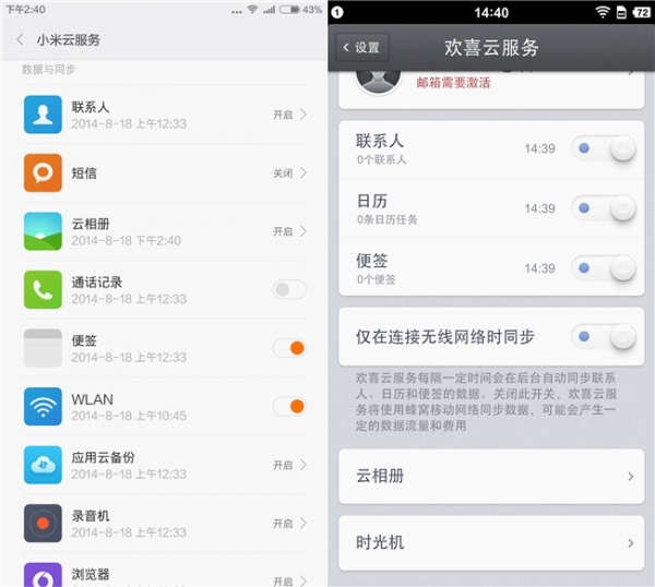 我个人是颇为关注云服务的,由于习惯性问题,经常进行刷机等可能导致资料丢失的操作,一个完善且完整的云服务可以节省大量的备份时间与恢复操作,MIUI 6的小米云服务与Smartisan OS的欢喜云服务并不是一个等级面上的。