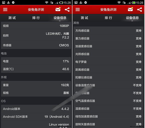 从上图可以看出,红米Note 4G安兔兔跑分在2.1万分左右,而此前的红米Note安兔兔跑分在2.4万分,这是在新版安兔兔跑分软件中,测试的结果,稍早一些版本的红米Note安兔兔跑分会在2.7万分左右,而红米Note 4G在2万分左右。因此实际上,红米Note 4G版更换为四核CPU后,其性能相比上一代红米Note还是有一定幅度的下降。