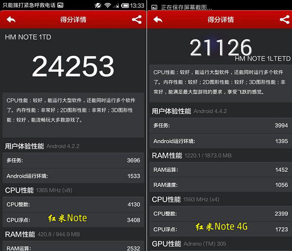 图为红米Note与红米Note 4G安兔兔跑分对比