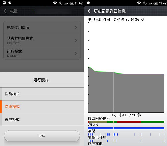 续航方面,4G版红米Note内置了3100mAh可拆卸电池,同样也提供了“均衡模式”和“省电模式”可选。实际测试中,为了保证完好的体验,我们采用其中默认的“均衡模式”。