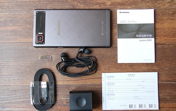 开箱后,可以看到联想K920手机配件非常全面,拥有联想VIBE Z2 Pro主机、耳机、充电器、数据线、卡针以及三包说明书等,如下图所示: