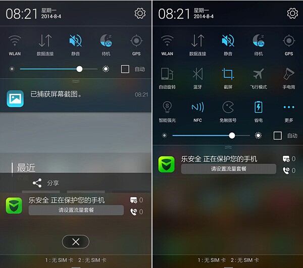 下拉菜单的上部是快捷开关,通知栏在它的下方,日常操作也非常方便。