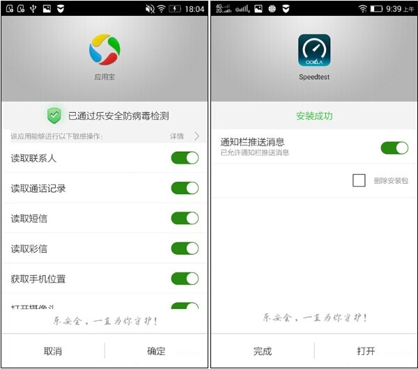 另外乐安全也是VIBE 2.0系统值得一提的方面,提供了“流量监控”“手机加速”“敏感行为监控”“广告拦截”“病毒查杀”“骚扰拦截”“吸费克星”等功能,完全不必安装第三方安全应用。