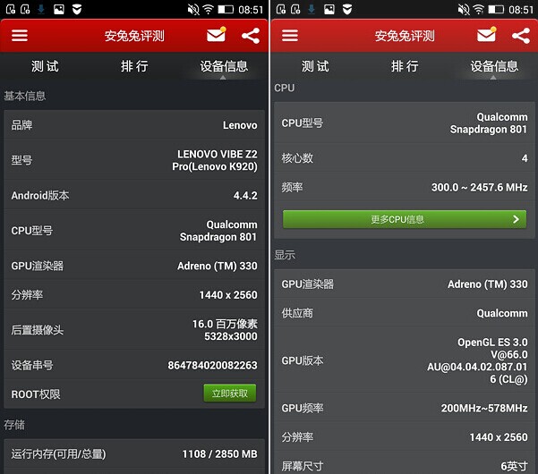联想VIBE Z2 Pro硬件配置非常彪悍,其采用了2.5Ghz高通801四核处理器,运行3GB RAM大内存,内置32GB大ROM存储空间,硬件规格非常高,下图为安兔兔软件检测到的联想K920硬件配置信息。