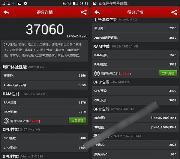 为了更直观的让大家了解,联想K920性能如何,下面我们以最常用的安兔兔跑分软件,来测试下联想K920性能跑分如何。通过测试,可以看到,联想K920安兔兔跑分超过了3.7万,达到了如今顶级旗舰机跑分水准,如下图所示。