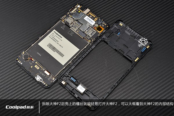 酷派大神F2后盖可拆卸,并且电池也可以自行更换,手机的内部结构和大神F1一样,拆机从内部开始,拆解难度也相对比较简单。