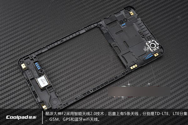 酷派大神F2采用智能天线2.0技术,后台上有5条天线,分别是TD-LET、LET分集、GSM、GPS和蓝牙Wifi天线。