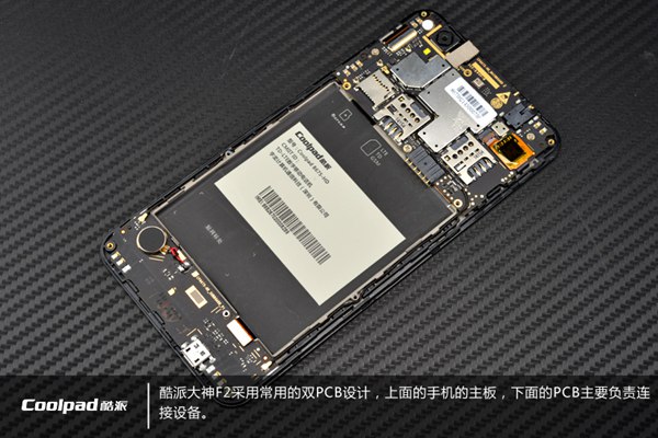 酷派大神F2内部采用了常见的上下双PCB设计,上面的是核心大主板,下面的小主板则主要负责连接设备,如下图所示: