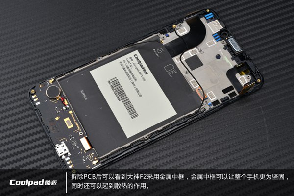 拆除大PCB主板后,我们可以看到,酷派大神F2采用了金属中框,金属中框可以让整个手机更为坚固,同时还起到散热的作用。