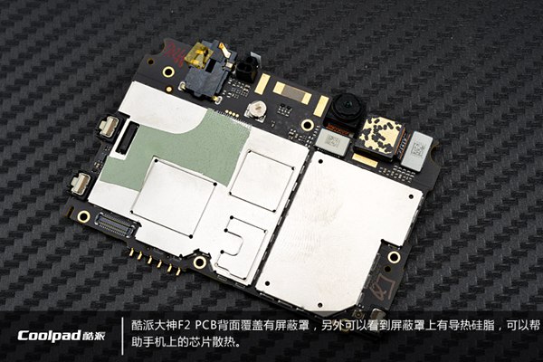 酷派大神F2主板的背面覆盖有屏蔽罩,另外可以看到屏蔽罩上有导热硅胶,可以帮助手机上的芯片散热。