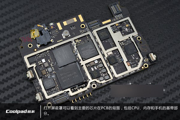 打开主板背面芯片上的屏蔽罩后,就可以看到酷派大神F2核心控制芯片了,包括CPU、内存、手机的基带芯片等部分,如下图所示: