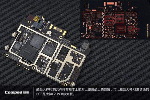 酷派大神F2的元件排布基本能对上邀请函上的位置,可以看到,大神F2邀请函的PCB是大神F2的放大版。