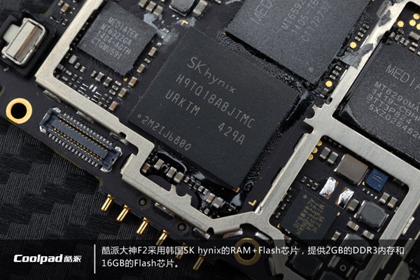 酷派大神F2采用韩国SK hynix的RAM+Flash内存芯片方案,提供2GB DDR3内存+16GB Flash存储芯片方案。