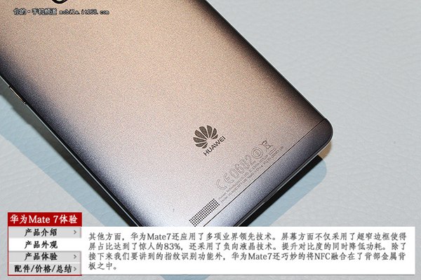 其他方面,华为Mate 7还应用了多项业界领先技术,屏幕方面不仅采用了超早边框,是的平展比达到了惊人的83%,另外还采用了负向液晶技术,提升对比度的同时降低功耗,另外还有国内首创的按压式背部触控指纹识别。