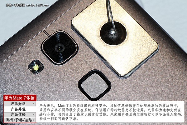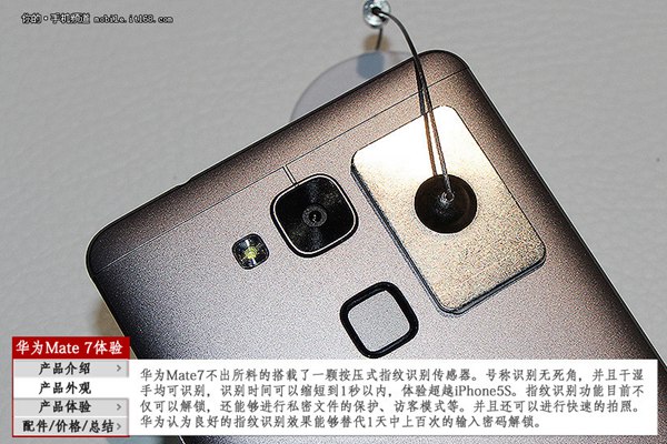指纹识别方面,华为Mate 7背部摄像头下方但是在了一颗按压式指纹识别传感器,号称识别无死角,并且干湿手均能识别,识别时间可以缩短到1s以内,体验超越iPhone5s。