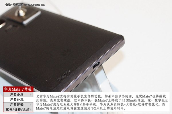 续航方面,华为Mate 7内置4100mAh超大容量电池,另外结合软件优化省电,华为声称在重度使用下,续航是时间也能做到2天以上,续航上是非常不错的。