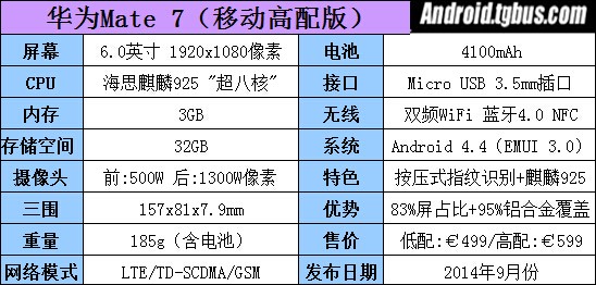 在详解之前,首先笼统地看一下Mate7的配置吧。它搭载海思海思麒麟925“超八核”处理器,其中包含mali-628 MP4型号GPU。RAM与ROM分别达到3GB与32GB(标配:2GB RAM / 16GB ROM )。屏幕方面,Mate7采用了一块6英寸超视网膜屏,分辨率将达到1920×1080。