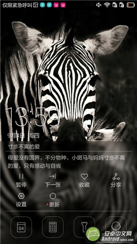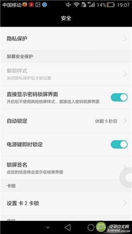 华为Mate 7搭载了EMUI 3.0系统基于Android 4.4.2制作,从解锁界面上看,相比之前版本,整体界面风格有了很大的改变。颇受好评的“杂志解锁”基本没有变化,依旧支持31张精美壁纸自动循环播放。另外解锁方式也并不花哨,只需要向右侧滑动屏幕就可以解锁了,当然还支持指纹解锁等其他解锁方式。值得一说的是,点击右下角的相机图标向上滑动还可以激活相机功能。