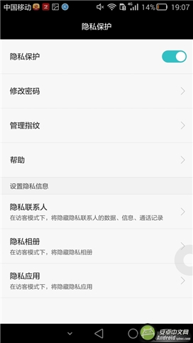 ▲访客模式:通过右手指纹可进正常模式,左手指纹可进隐私模式