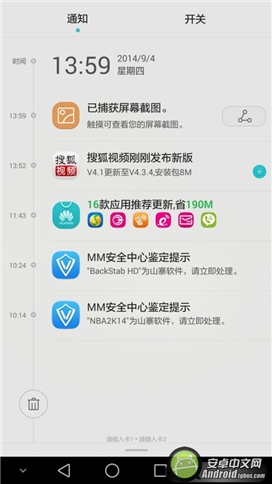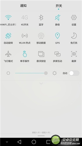 EMUI 3.0的下拉通知栏与快捷操作栏也有了新的变化。通知栏采用了时间轴的排列,快捷操作栏的图标也变得更加的细腻。另外在通知栏中还可以切换出控制中心,里面为大家提供了12种快捷按钮,非常方便。