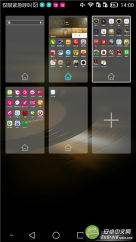 EMUI 3.0采用的是四格平铺显示,将程序上下拖动便能将后台关闭,新加入的锁定后台程序则是在后台管理界面中拖动单一程序卡片向下拖动完成程序锁定。另外,一键清除所有后台则是在所有应用卡片下方向上滑动清空所有后台应用。在菜单编辑界面,除了一般手机都支持的功能外,EMUI 3.0还在下方增添了屏幕切换效果和屏幕布局两种功能。