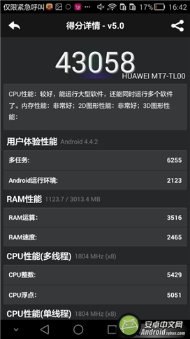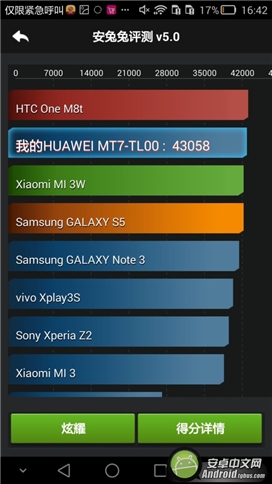 华为Mate 7搭载了一颗全新超八核Kirin 925芯片处理器,GPU为mali-628 MP4。NenaMark 2测试时帧速一直保持在60.1fps上,在图像处理上Mate7的分数已经相当高了。Vellamo Htmls 1960分Metal 1182分,在一般浏览网页时能达到非常稳定的状态。安兔兔43058分,可以看出Mate7机器性能方面非常强悍。