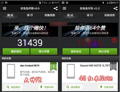 大神F2和4G红米Note安兔兔跑分成绩对比