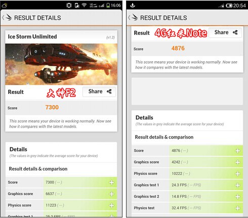 另外决定一款手机性能好坏,还需要看起GPU图形性能成绩,一些偏大型游戏,对GPU性能比较看重,下面我们通过知名的3Dmark软件测试大神F2和红米Note 4G图形性能成绩。