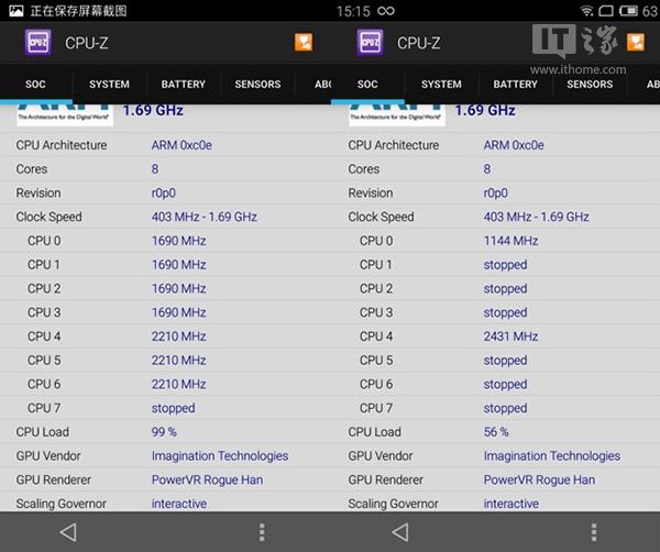 日常使用情况下有单一A17核心搭配1到3个A7核心等多种组合,闲置或待机时只开启一个A7核心,这时候的工作频率为403MHz。我们也在实际体验中发现了联发科MT6595存在自动超频现象,单个A17核心的最大主频可被动态超频至2431MHz,而单个A7核心则可以达到1800MHz以上。