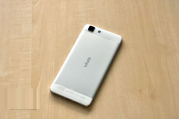 vivo手机的外观一直走中庸的路线,没有什么特别的设计,配色也基本以白色银色为主。这款vivo X5起码从正面看上去没有给人惊喜,白色面板,左上角的vivo商标,没有做隐藏处理的三个实体触摸键,一整块玻璃面板覆盖正面,平淡中庸。手机的背面设计也是似曾相识,三段式机身,铝合金后盖,中间竖着镶嵌了vivo商标,还有突起的方形摄像头。侧面的铝合金中框颇有质感,电源键和音量键在一侧,vivo X5的厚度仅为6.3mm,侧面看上去非常纤细。