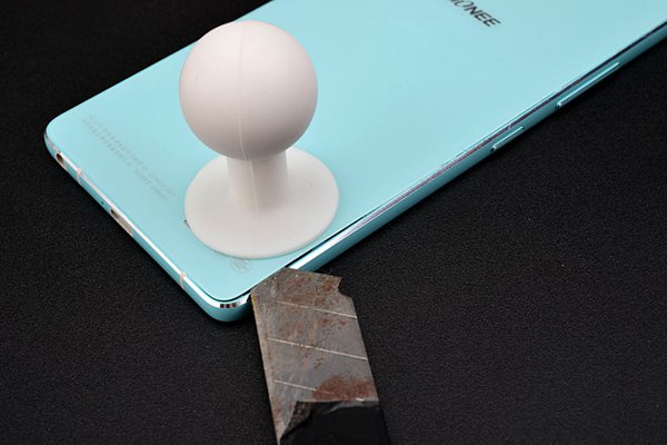 正如上面所料,金立S5.1拆机确实比较困难,通过电吹风对背面进行加热,再使用吸盘和刀片才终于可以将金立Elife S5.1的后盖分离,如下图所示。