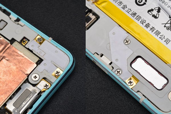 金立Elife S5.1支持4G网络,需要更多天线接口进行信号溢出,可以看到手机的天线分别在手机的PCB旁边和下方的外放音腔,如下图所示。